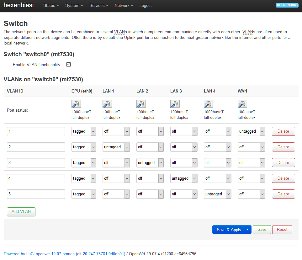 hexenbiest_Switch_LuCI_1 November 12, 2020 963 × 829 hexenbiest_Switch_LuCI_1 This is how the switch configuration should appear in Luci if your VLANs are configured properly.
